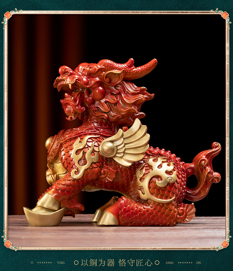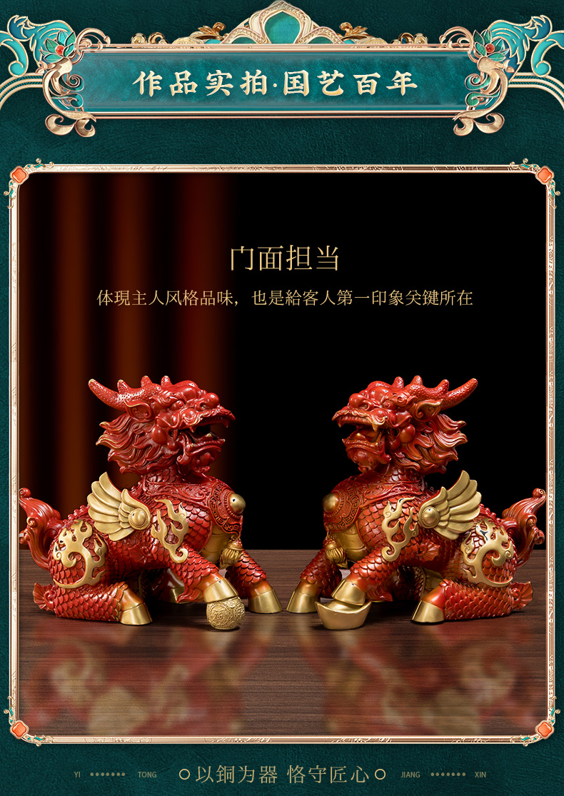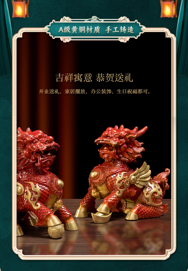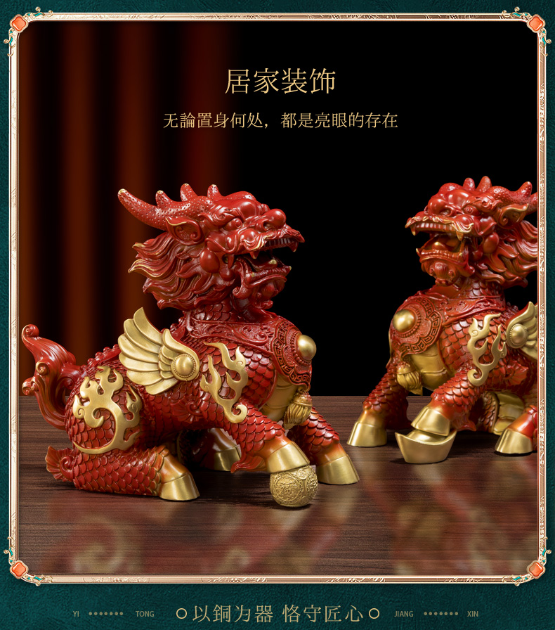 全铜火麒麟摆件公母一对红色公母纯铜黄铜家居办公室客厅玄关装饰