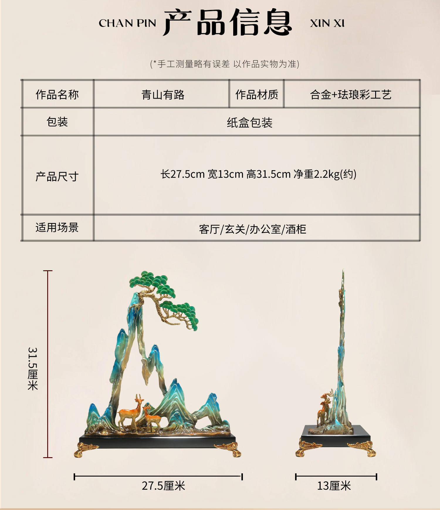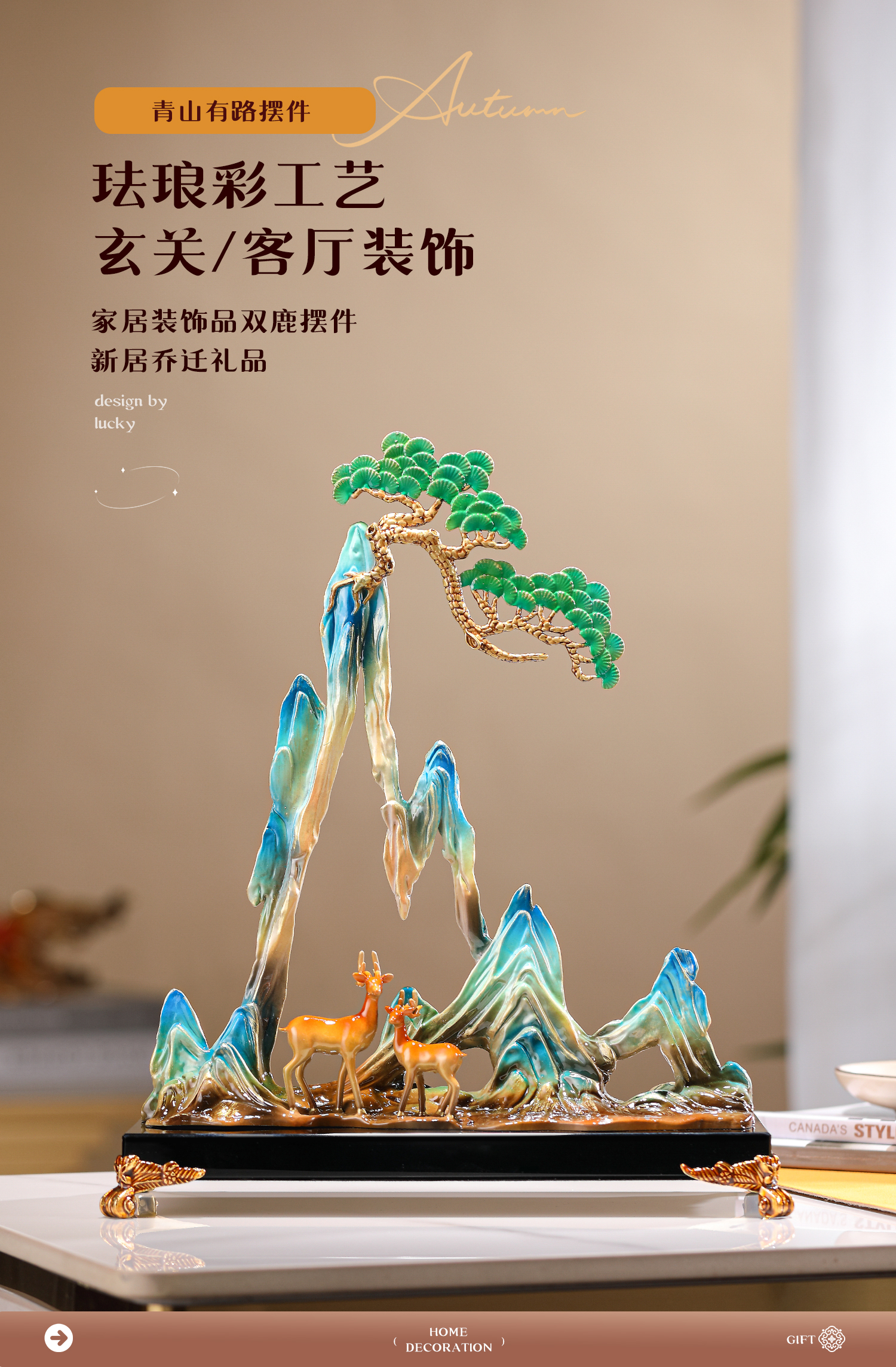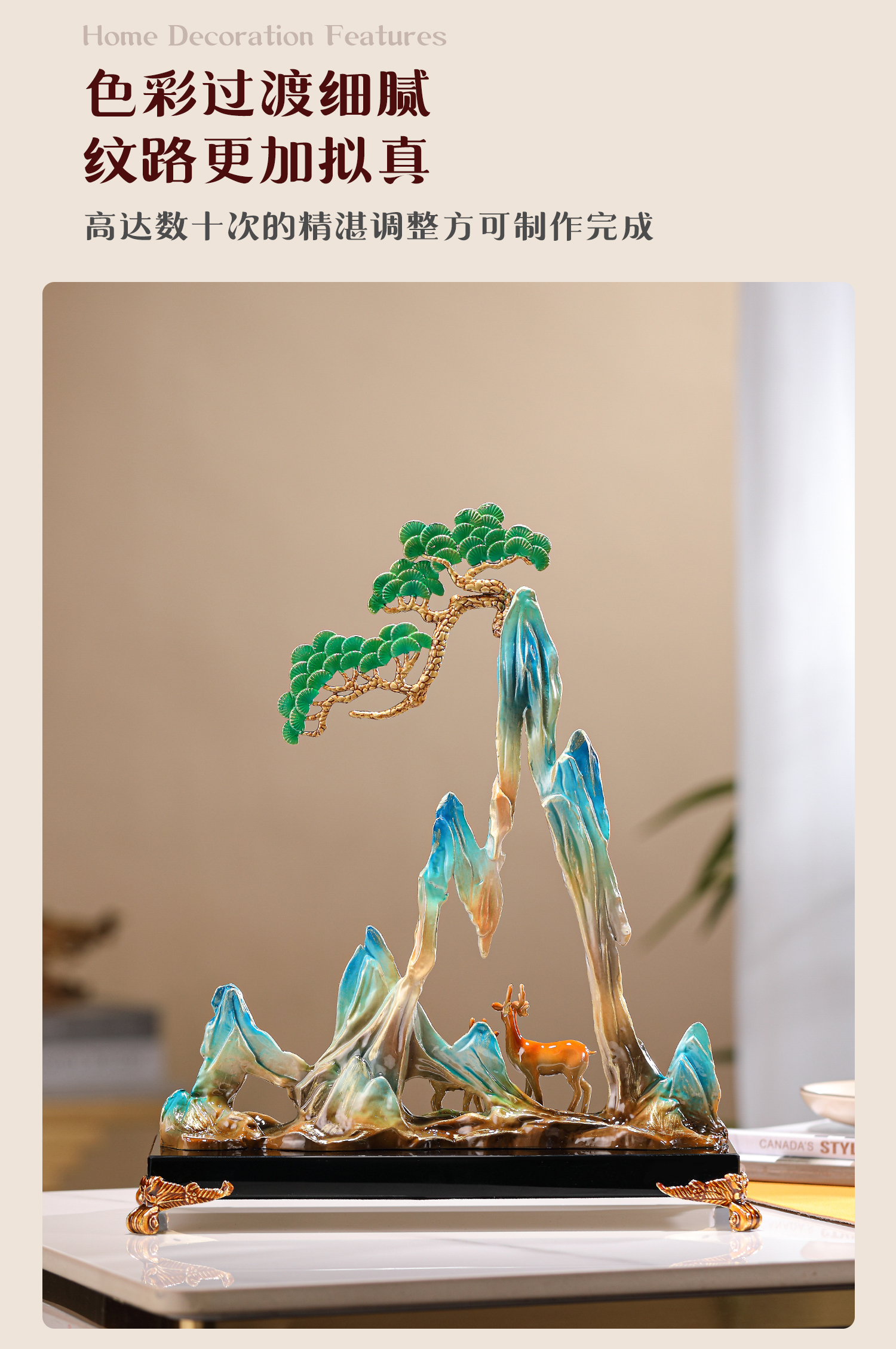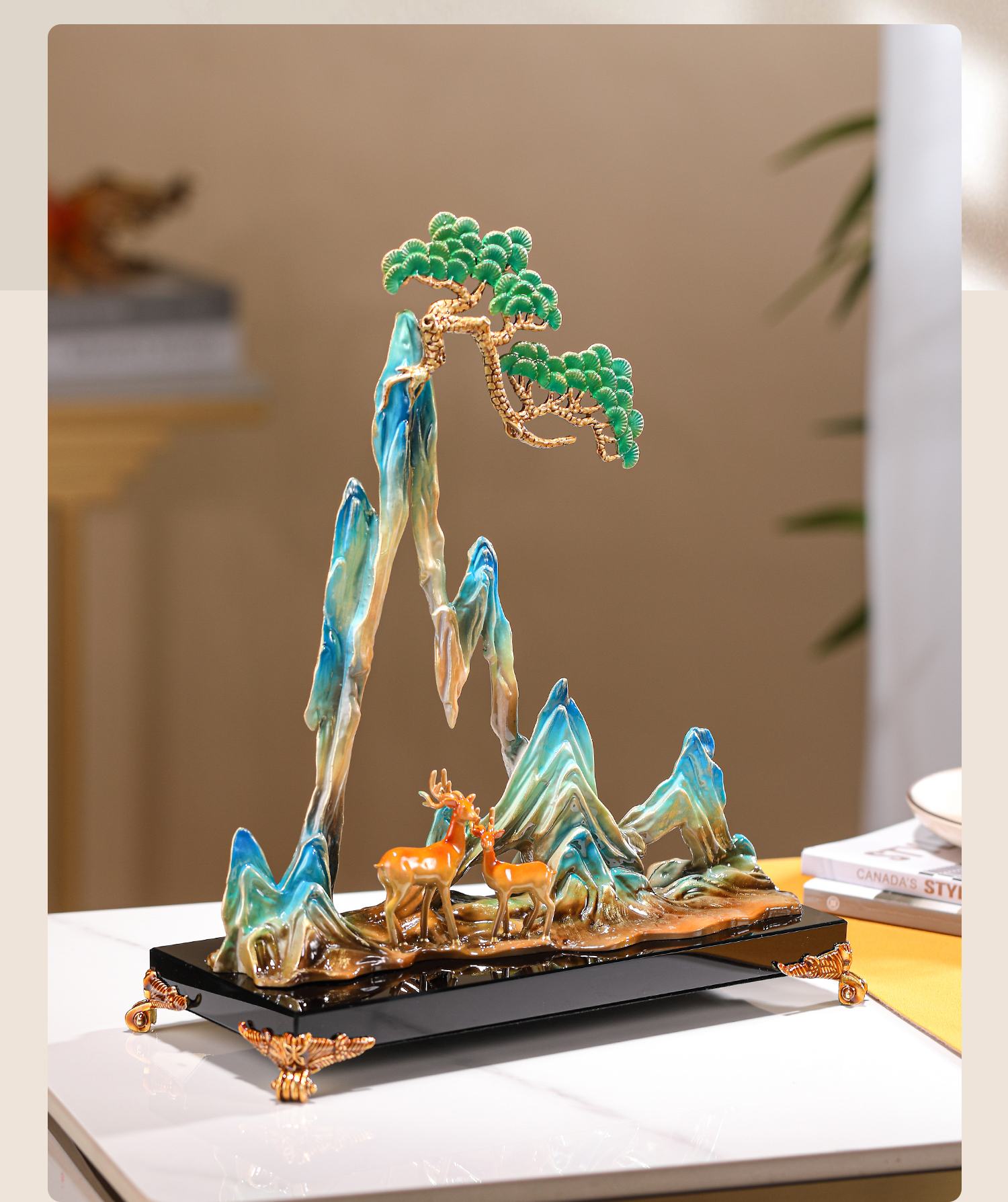 珐琅彩合金艺术品摆件青山有鹿新中式家居客厅酒柜玄关创意装饰品